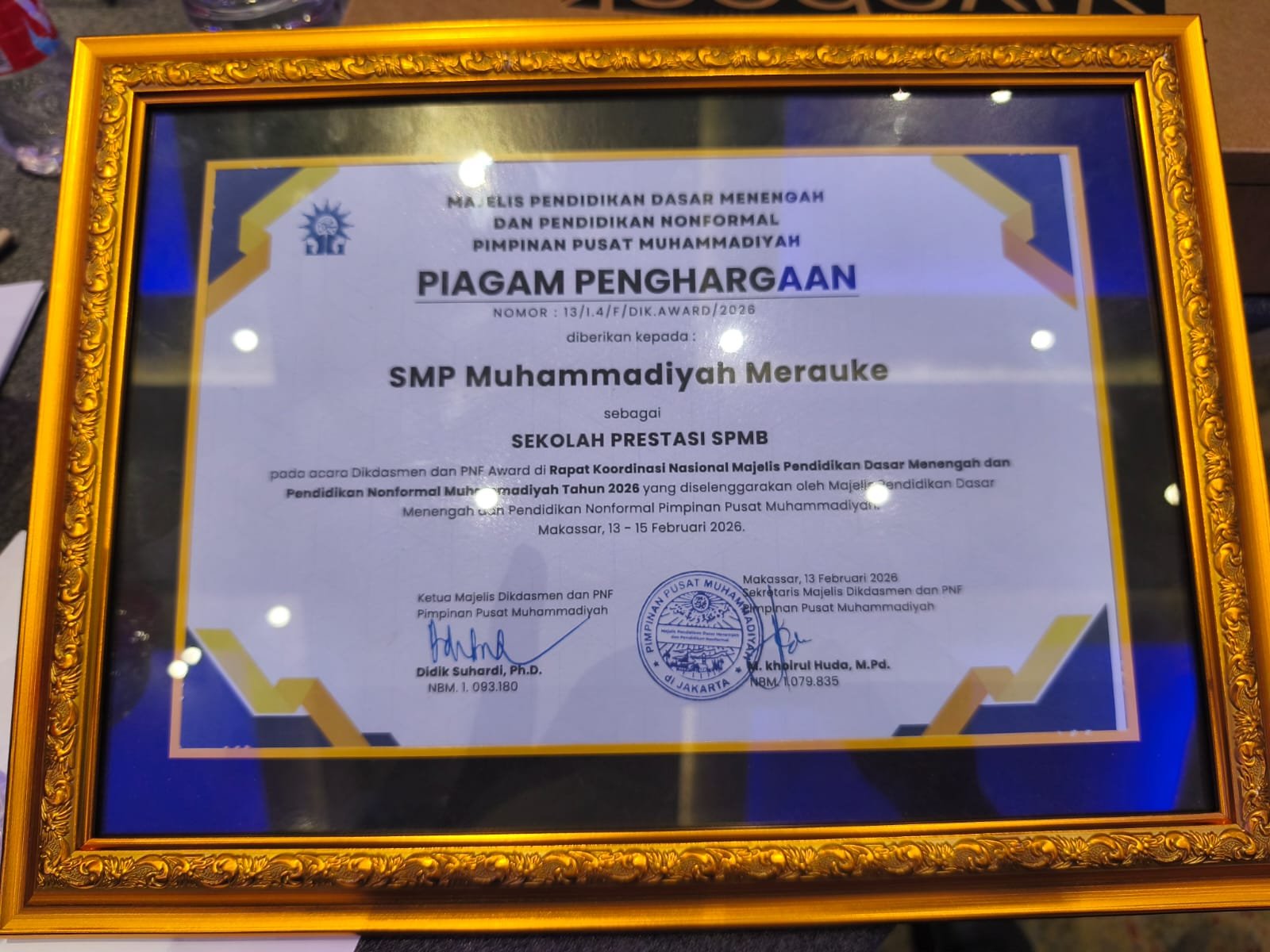 MAKASSAR – Kabar gembira datang dari ajang nasional di Sulawesi Selatan. SMP Muhammadiyah Merauke resmi menerima penghargaan sebagai Sekolah Prestasi SPMB dalam Rangkaian acara Rakosnas Dikdasmen dan PNF PP Muhammadiyah.